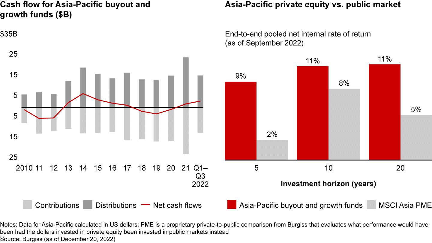 A couple of developments highlight the sobering economic shift for private equity investors. China’s GDP growth dropped to 3% in 2022, down sharply from an annual rate of about 7% during the last decade, and the largest GDP slowdown in the region. Covid lockdowns contributed to sluggish domestic consumption; China’s Consumer Confidence Index dropped by 28% on average from April to November 2022, compared with the year-earlier average. Both India and Southeast Asia reported robust economic growth, but high inflation. Australia’s Consumer Price Index rose by a record 7.8% in the fourth quarter of 2022. Japan and South Korea struggled with sharp currency depreciation in 2022—20% and 13%, respectively—against the US dollar over the previous year.