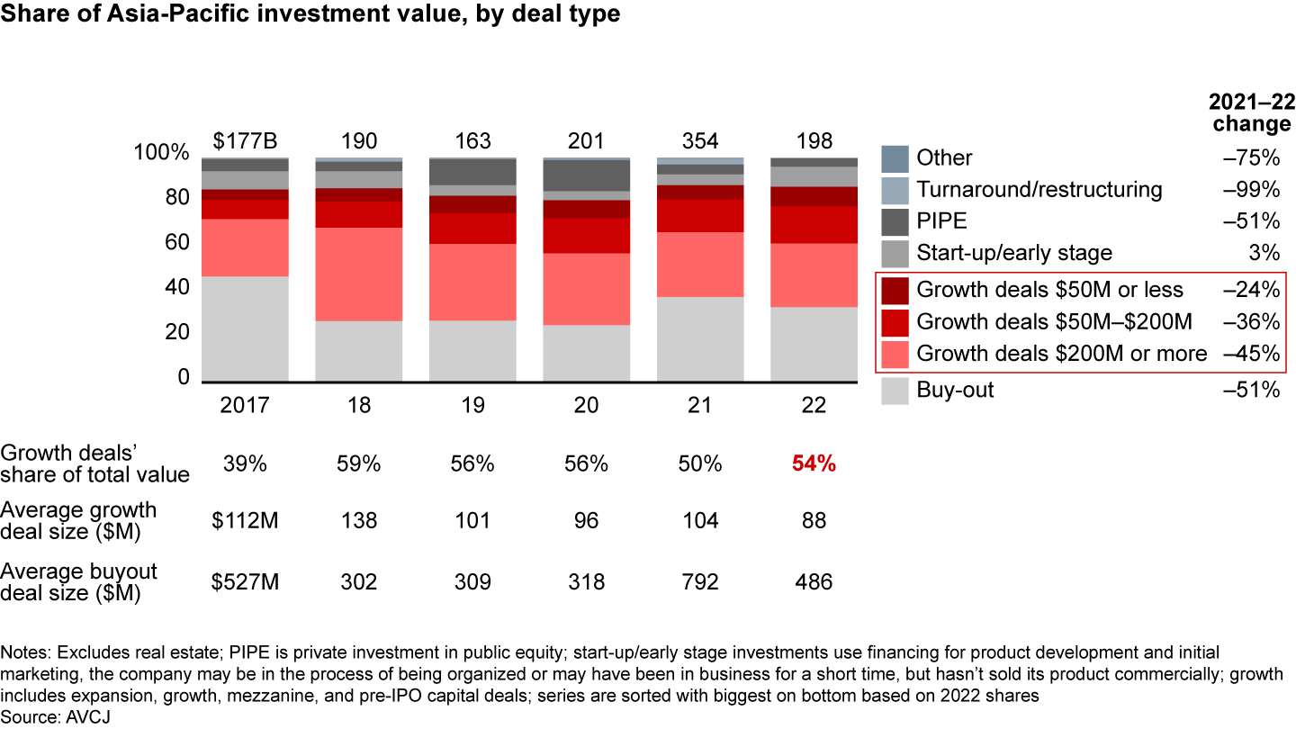 Investors’ shrinking appetite for risk sharply reduced the number of large growth deals in Greater China and India. Together, Greater China and India accounted for a $35 billion decline in total deal value for big-ticket growth deals in 2022.