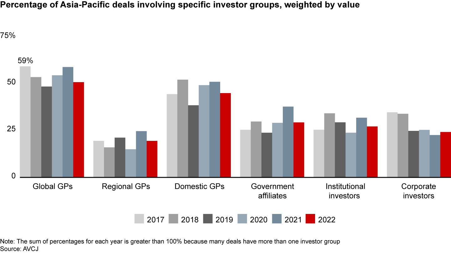 Global GPs and domestic GPs continue to be the largest investor groups, based on deal value. The share of corporate investors rose slightly in 2022 (see Figure 10).