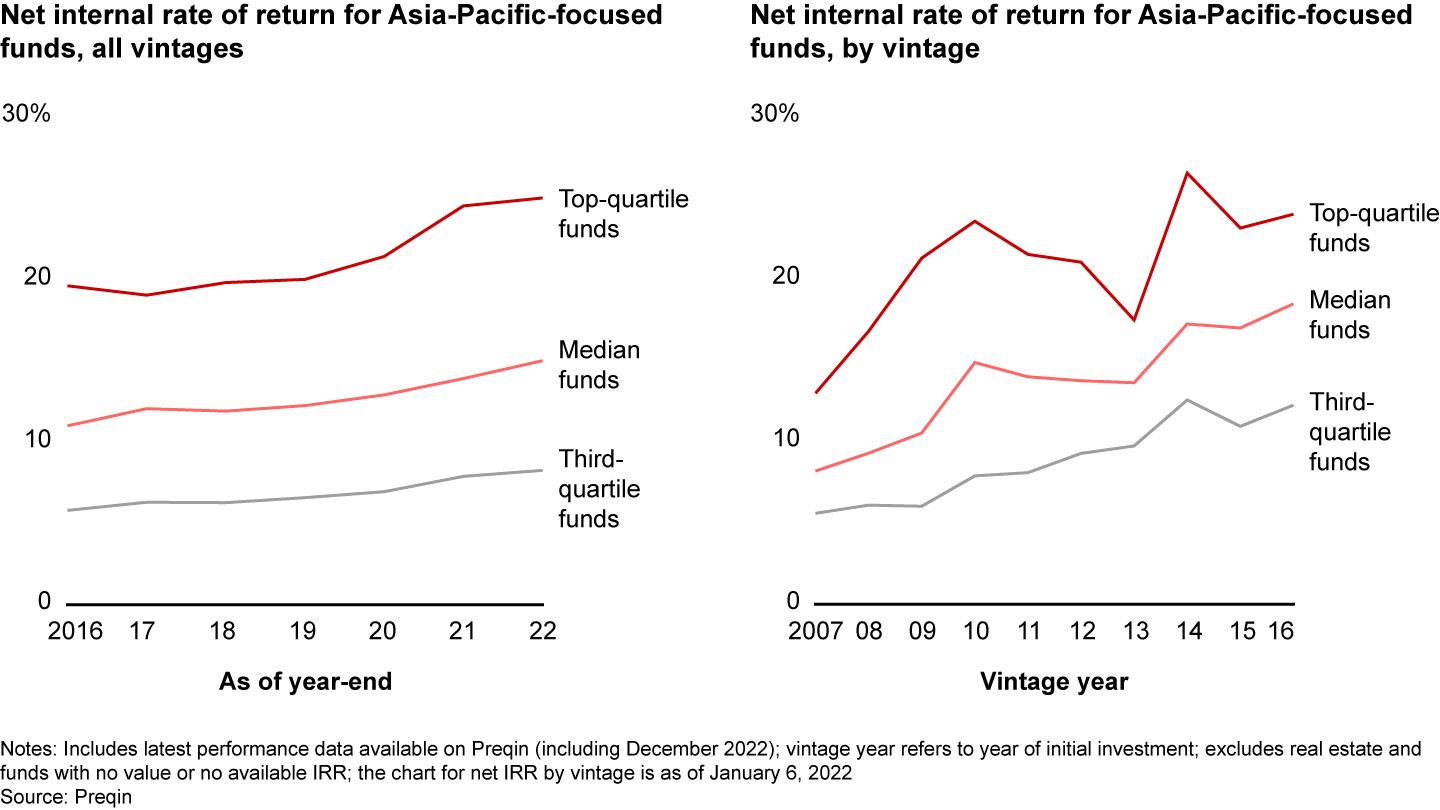 Despite the sharp drop in dealmaking, exits, and fund-raising, Asia-Pacific PE returns rose to a new high of a 15.0% median net internal rate of return, from 13.9% a year earlier. Top-quartile funds continued to deliver robust returns well above expectations, at 25% median net IRR (see Figure 21).