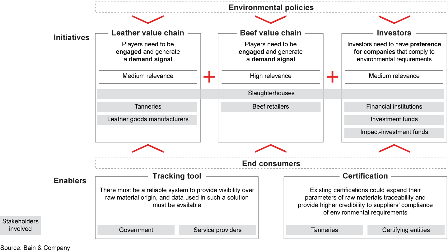 No single actor in the value chain can develop a comprehensive solution. A robust solution will require motivating a broad collection of stakeholders, making sure their interests align in order to gain traction. Three main pillars of the cattle industry—leather, beef, and investors and lenders—will need to work together to create lasting change (see Figure 5).