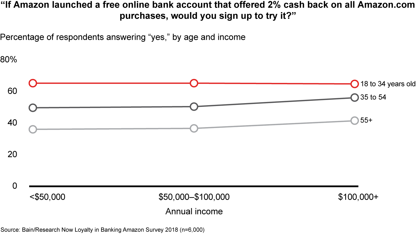 Our survey suggests that Amazon can count on significant demand for basic banking services. Among Amazon Prime respondents (who pay an annual fee for such perks as free two-day shipping), 65% say they would try a free online bank account offered by Amazon, with 2% cash back on Amazon purchases, similar to the company’s cobranded credit card. Of Amazon customers who aren’t Prime members, 43% would try such an account. Even among people who don’t use Amazon for e-commerce purchases today, 37% would try it (see Figure 2).