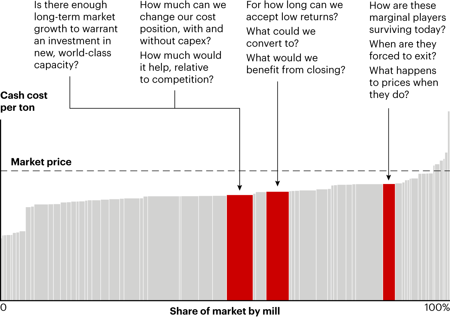 Successful companies also improve their cost position by investing in efficiency. They do not necessarily add capacity but continuously push to produce every ton at a lower price. They do so by improving energy and variable cost efficiency or by using automation to lower labor costs.