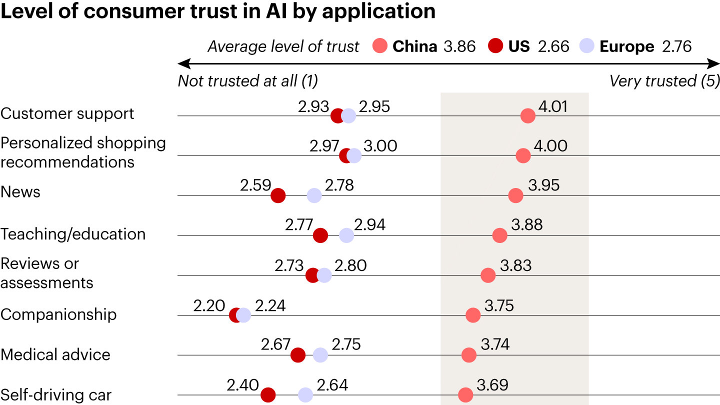 Strikingly, our research also shows that Chinese consumers are 45% more trusting of AI than their counterparts in the US, and 40% more than Europeans (see Figure 4). This finding shouldn’t be overinterpreted. For one thing, it’s important to note that Chinese shoppers aren’t immune to the AI privacy concerns that are being raised in many other countries. But that outsized expression of trust certainly suggests that there’s potential for rapid AI growth in Chinese retail.