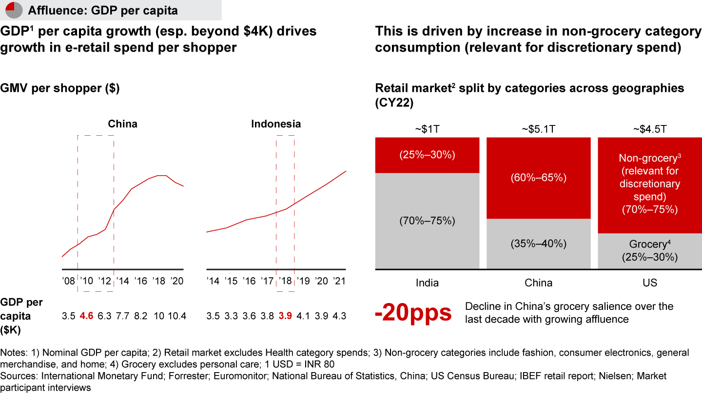 The fourth trigger point, affluence, is yet to be fully realized. Growth in GDP per capita will be critical to unlock e-retail growth over the next decade. Typically, when GDP per capita crosses the threshold of approximately $4,000, it drives a sharp increase in online spending per shopper and discretionary spending. In India, an estimated 60–70 million households will join the upper-middle- and upper-income cohorts, which in turn are likely to account for at least 85% of e-retail spending by 2028. Government initiatives such as the Open Network for Digital Commerce will further propel the growth of e-retail in India.