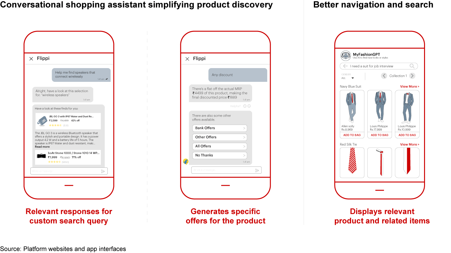 Global e-retailers have adopted multiple use cases, from designing personalized advertising campaigns to using chatbots for faster customer service. Flipkart Group has been the torchbearer of generative AI applications in India’s e-retail space, with multiple live experiments. Most notable are end-to-end virtual shopping assistant “Flippi” by Flipkart and smart search tool “MyFashion GPT” by Myntra; these aim to make online shopping even more akin to the offline shopping experience.