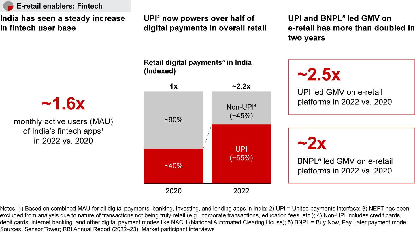 India’s annual transacting e-retail shopper base is estimated to scale to 230–250 million people in 2023. Over 100 million of these shoppers were added over the last three years.