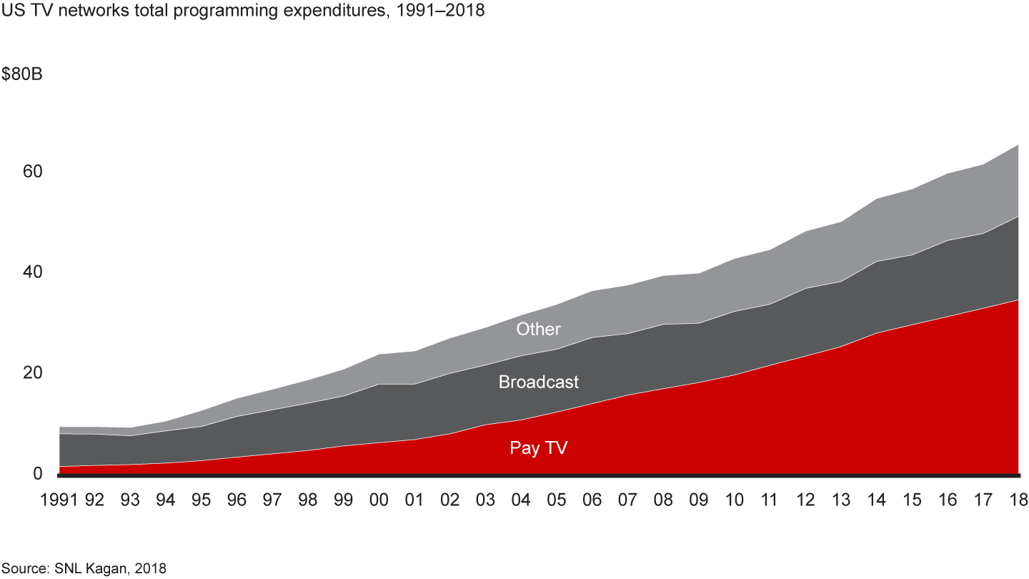 This “go big, or go home” mentality hasn’t been limited to the big screen. The enormous success of television series like Friends and ER, which at their peaks cost more than $10 million per episode, generated outsized rewards for their owners, opening purse strings for hundreds of shows and showrunners as well as the massive web of production services, agents, assistants and even caterers supporting that ecosystem. In the US, an enormous influx of capital from the rise of pay TV, which started plowing billions of dollars into the industry in the 1990s, accelerated this growth even further (see Figure 1). Today, episodes of the final season of HBO’s Game of Thrones cost upward of $15 million each.