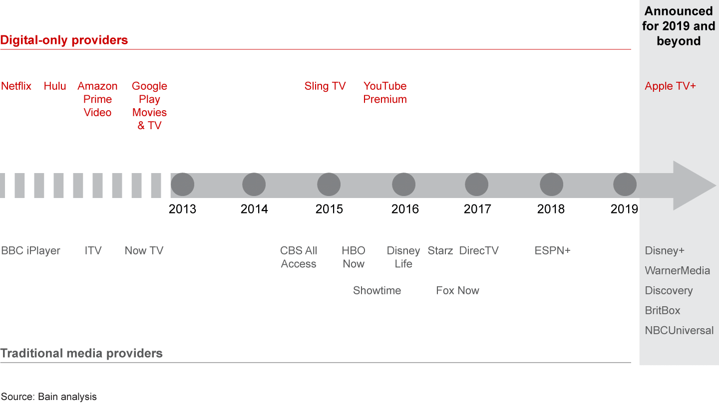 Studios and networks are responding by consolidating to grow bigger and acquire more content (Disney and 21st Century Fox, Discovery and Scripps, and others likely to come) and to secure broader distribution (Comcast and NBCUniversal, AT&T and Time Warner). And after years of offering limited streaming services primarily designed to protect their business models, media companies that were holding out are finally launching full-throated over-the-top services, headlined by offerings from Disney, NBCUniversal and, in the UK, BritBox by ITV and BBC (see Figure 2). Disney's low monthly price and enormous library are certain to ratchet up the pressure on other streaming players, particularly those with undifferentiated content and less favorable economics. Incumbents are also rapidly investing in their own digital and analytic capabilities to close the gap with disrupters—competitive counterattacks that will require scale investments in familiar areas such as content and advertising as well as massive spending in newer areas such as mobile and platform technology, big data to personalize content, and digitized and personalized customer service.
