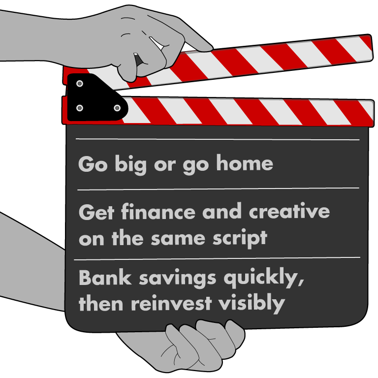 Aggressively drive results, and reinvest visibly. It’s important to bank real savings quickly to capture momentum. But if all you do is cut costs, there will be a crush at the door as talent flees to other studios. Leaders must show that they are reinvesting the savings in programs that generate growth. A strategic and disciplined approach toward investment in content creation and acquisition can help secure buy-in for the larger effort.