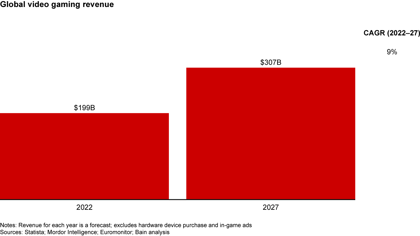 The future of the video game industry looks dazzling. Consumer demand is growing, technology is advancing quickly, and new monetization models are taking off. Bain’s analysis forecasts that global revenue for games could grow by more than 50% over the next five years (see Figure 1). And gamers’ foothold in virtual worlds—collectively called the metaverse—is far ahead of other consumers.