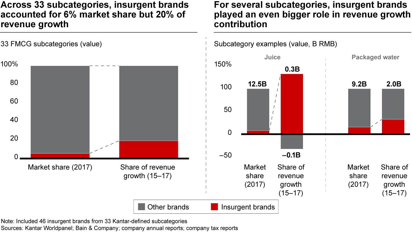 The strong performance also reflects the successful entry of local insurgent brands, which gained share from local and foreign brands alike. Indeed, Chinese local insurgents are making their presence known, capturing a disproportionate share of the FMCG growth. These brands have a clear vision and an entrepreneurial mission to fulfill unmet needs for Chinese consumers. They take a distinctly Chinese approach to building their brands and make their record-setting gains by moving at Chinese speed.