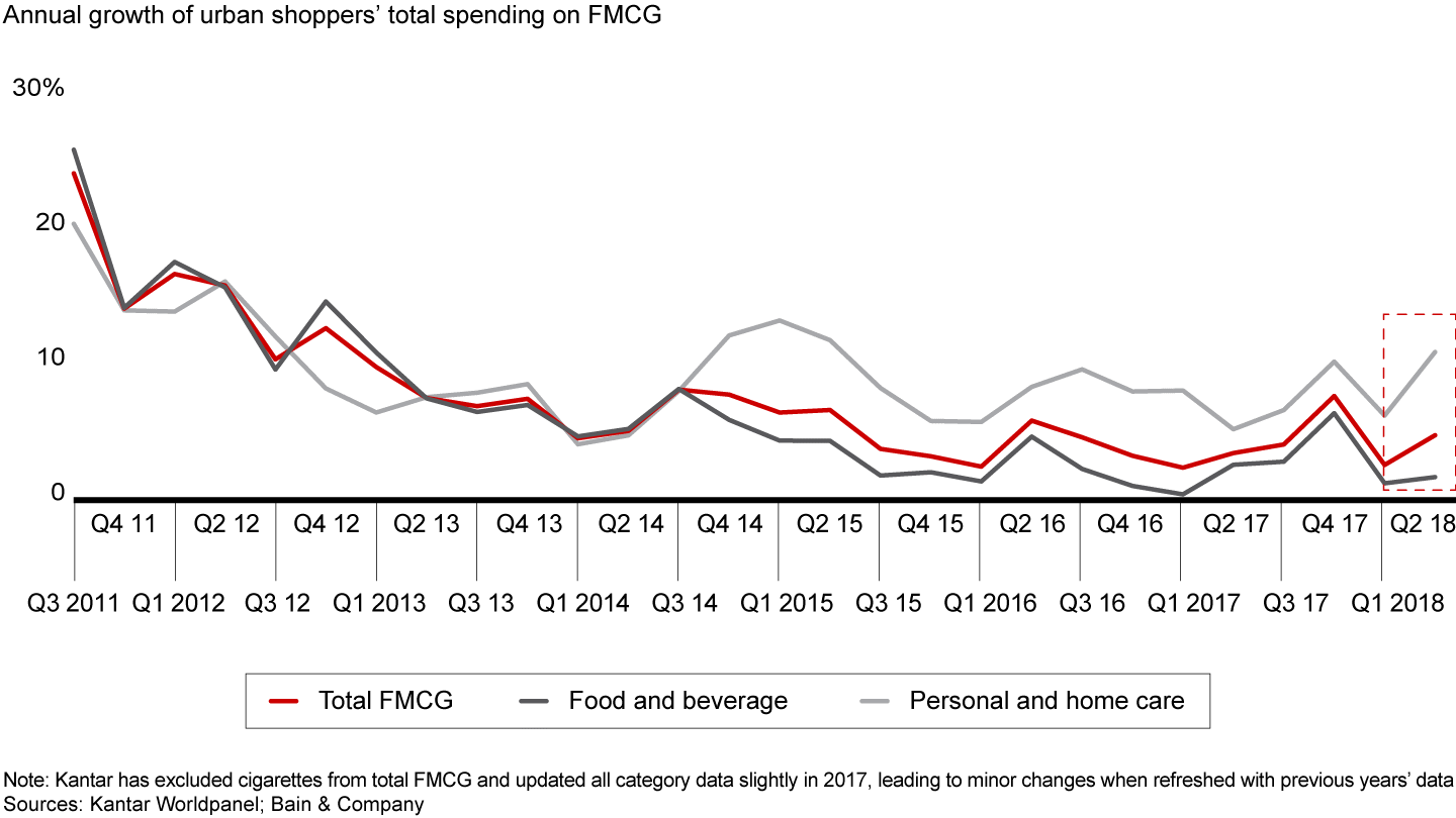For China’s fast-moving consumer goods (FMCG) industry, urban shoppers’ total spending in the first half of 2018 grew by 3.3%. This was much higher than the 2% growth observed between the first half of 2016 and the first half of 2017, confirming the recovery observed in H2 2017. Overall, a 1.3% FMCG volume decline was offset by a 4.6% rise in average selling price.