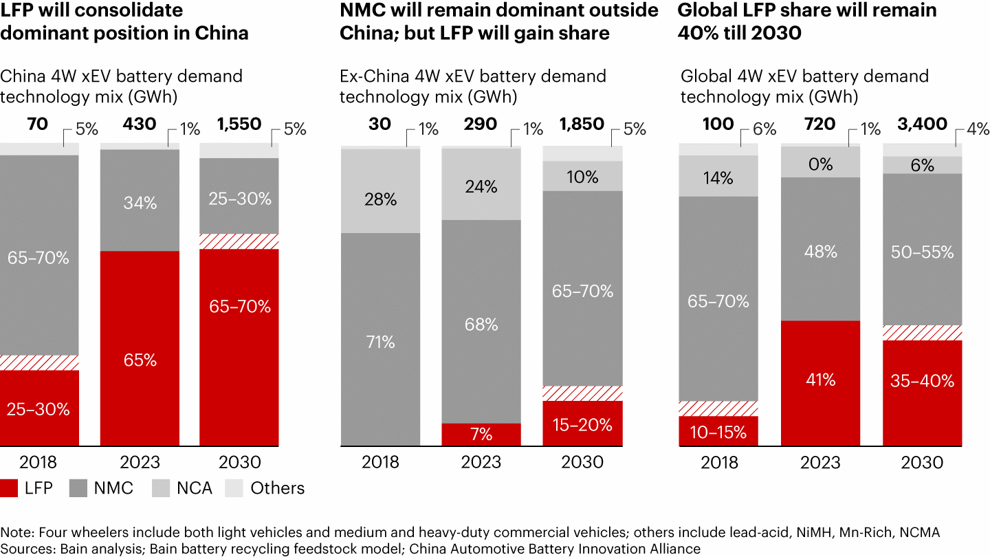 Lithium-iron phosphate (LFP) and nickel manganese cobalt (NMC) chemistries together currently make up more than 90% of lithium-ion battery sales for EVs. Nickel cobalt aluminum oxide (NCA) is expected to remain marginal due to its lack of performance or cost advantage compared to high-nickel NMC.