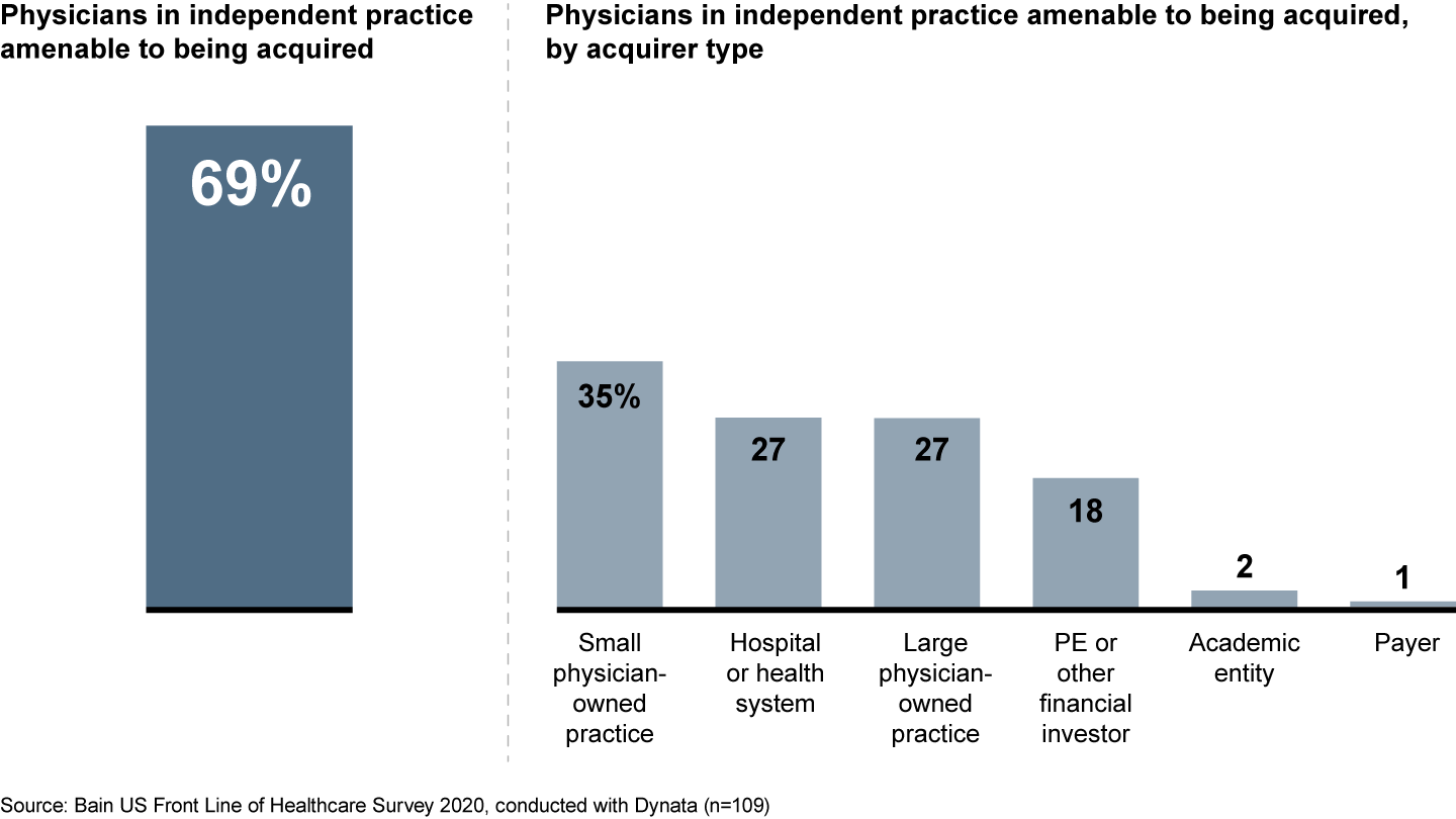Strained finances and a sharp drop in procedure volumes have pushed organizations hard hit by the pandemic to entertain acquisition offers. Bain’s 2020 US Front Line of Healthcare Survey showed 70% of physicians in independent practices were amenable to acquisition (see Figure 1). The findings were consistent across surgical specialties (74%), primary care physicians (69%) and other office-based practices (67%). Both surgeons and office-based physicians were willing to consider an acquisition.