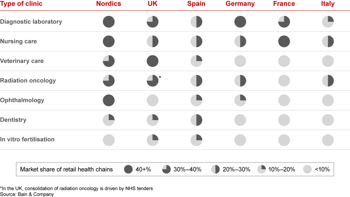 Across Europe, consolidation is most advanced in countries such as the Nordics, where regulators have been more liberal regarding consolidation and ownership models. Where corporate ownership of health clinics is highly regulated, as in France, care provision remains comparably fragmented. Countries that have recently eased regulations, such as Germany, have seen a spike in retail health consolidation.