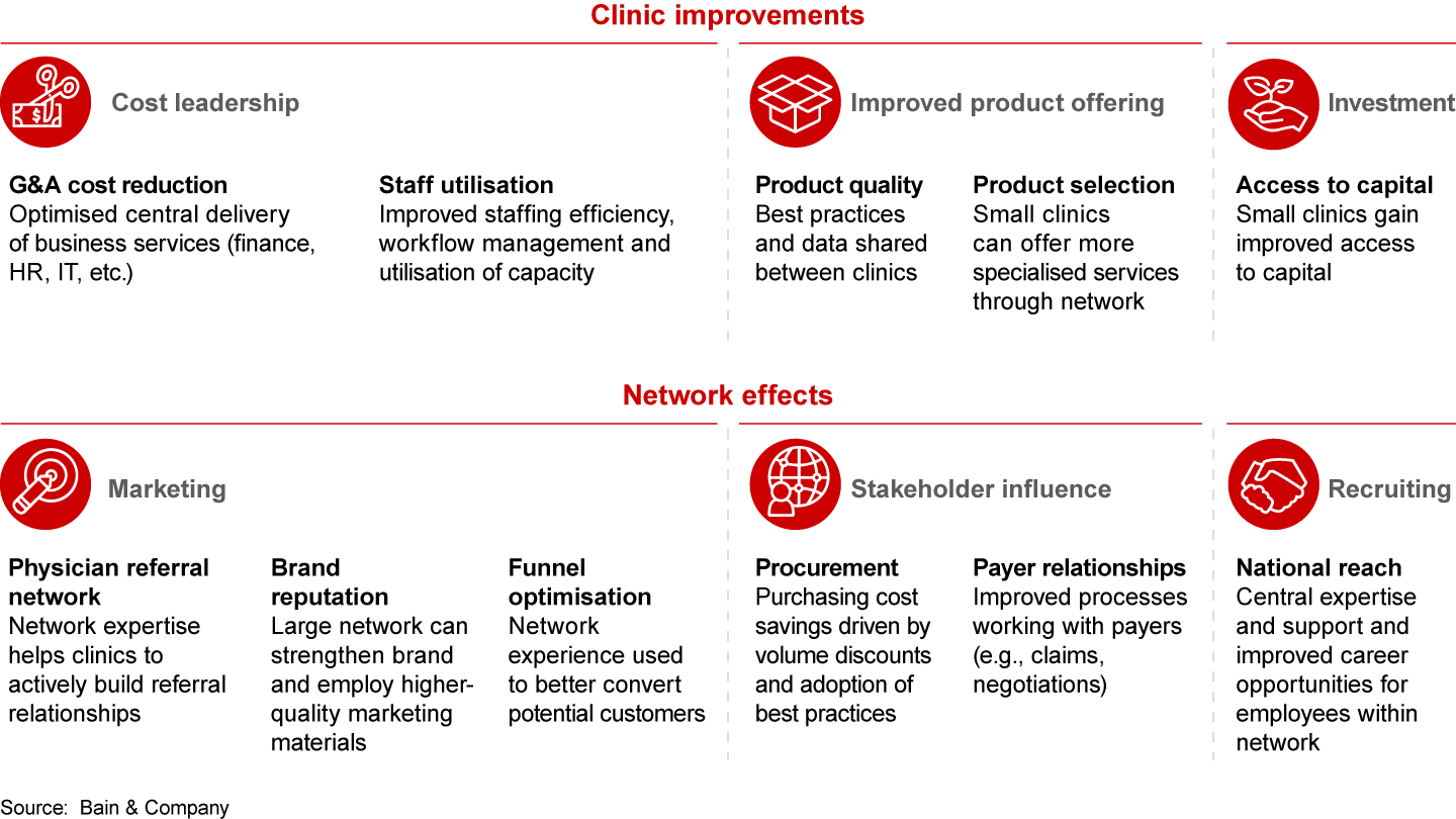 Network effects are the benefits specifically linked to the number of outlets in a chain. They include purchasing on a larger scale, patient referrals between clinics in the same chain, and better access to talent across all clinics within the chain. Network effects can improve marketing, the ability to influence payers and suppliers, and recruiting. Just as with digital and IT improvements, network effects require a minimum scale to be significant.