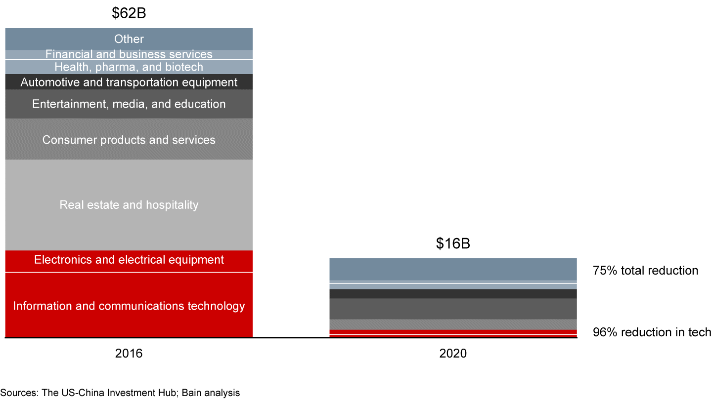 The US and China pushed the world in this direction, and the decoupling of their economies and technology ecosystems has been gaining momentum for several years. Consider this: Technology-related foreign direct investment between the two countries dropped by 96% from 2016 to 2020 (see Figure 1).