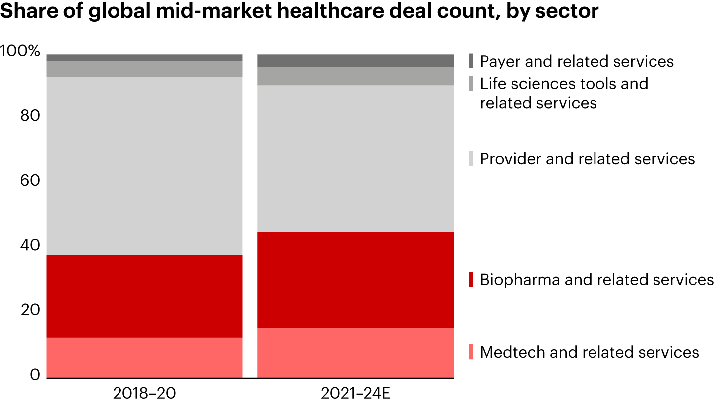 - While historically more concentrated in provider assets, mid-market PE firms have expanded their focus in healthcare IT and provider services while maintaining a strong presence in biopharma and medtech.
