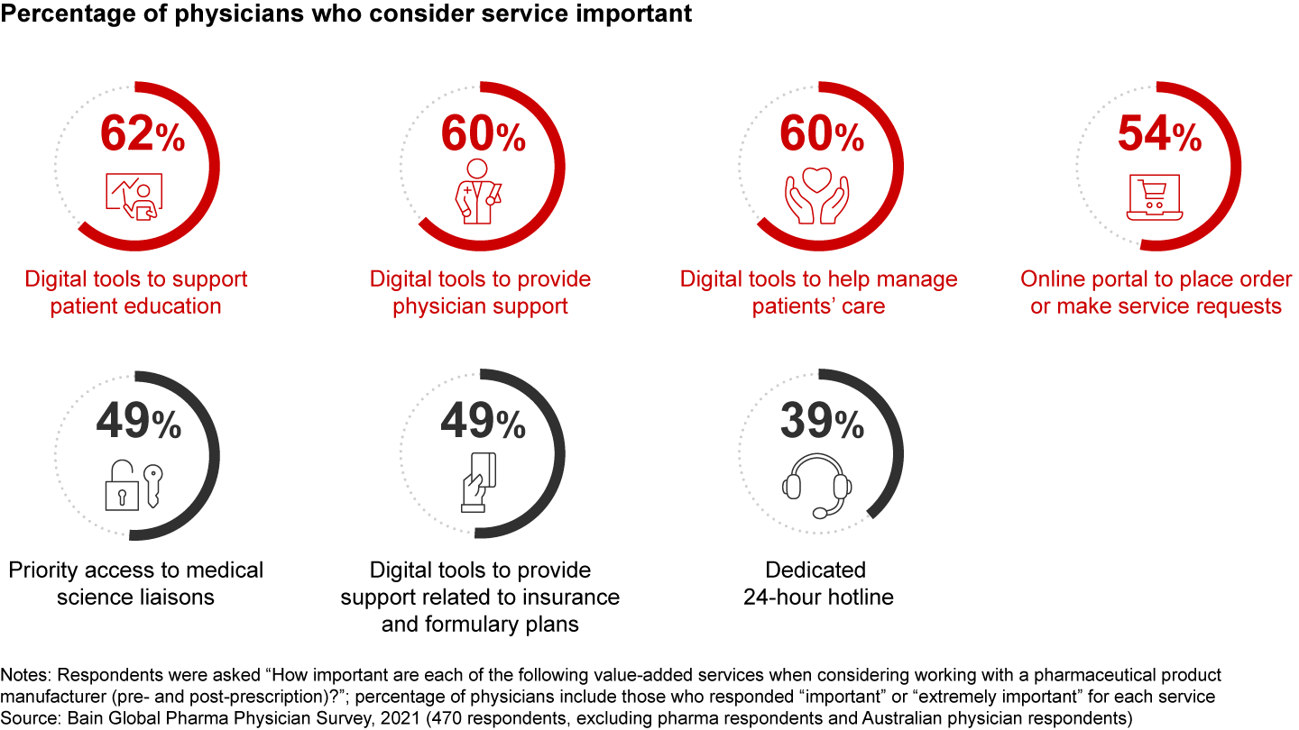 Moreover, the demand for digital services that help doctors support patients is growing: Around 60% of healthcare providers now say that digital tools to support patient education, provide physician support, and manage patient care are important when they consider working with a pharma product manufacturer (see Figure 4).