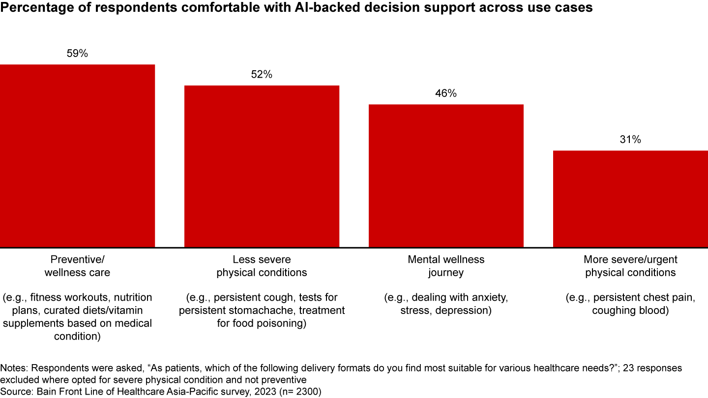 There has been a significant increase in healthcare technology adoption in the Asia-Pacific region over the past few years. Compared to 2019, only 22% of respondents in Asia-Pacific used telehealth services that involved a human doctor at the other end of the virtual platform; in 2023, over 50% of respondents are open to having AI as a facilitator in their healthcare delivery, particularly for preventive care and less severe physical conditions, demonstrating the substantial optimistic sentiment consumers now have toward the use of technology, especially AI.