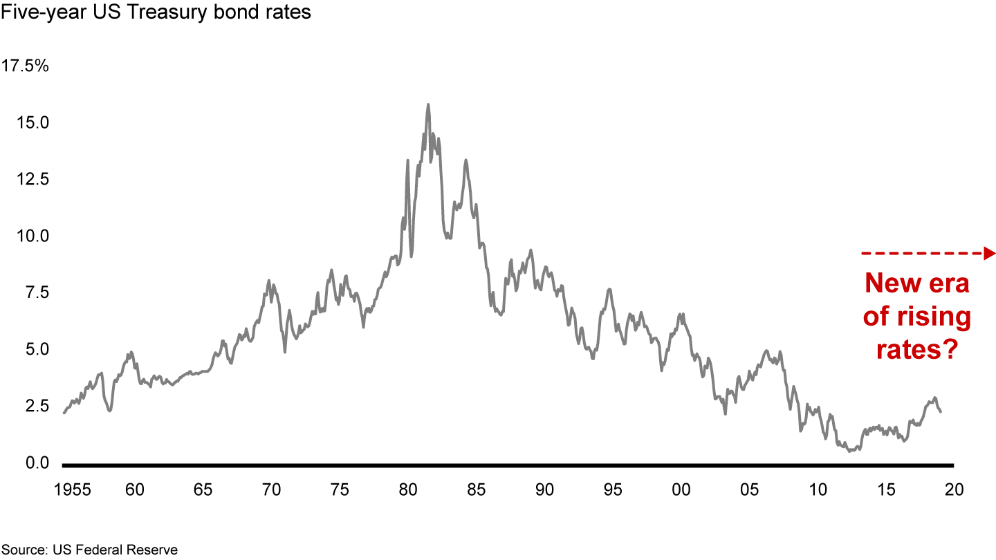 - The end of low interest rates. Interest rates still hover near a six-decade low (see Figure 1). Even if central bankers hold rates low during a downturn to help stimulate their economies, we expect to see rates eventually rise. This potential change in the interest rate environment will be a new regime for most management teams, and should prompt them to take a multiyear view of their capital structure and the timing of investments. A higher cost of capital will put pressure on capital spending, so if companies want to invest in technology, growth opportunities or acquisitions, the time is now.