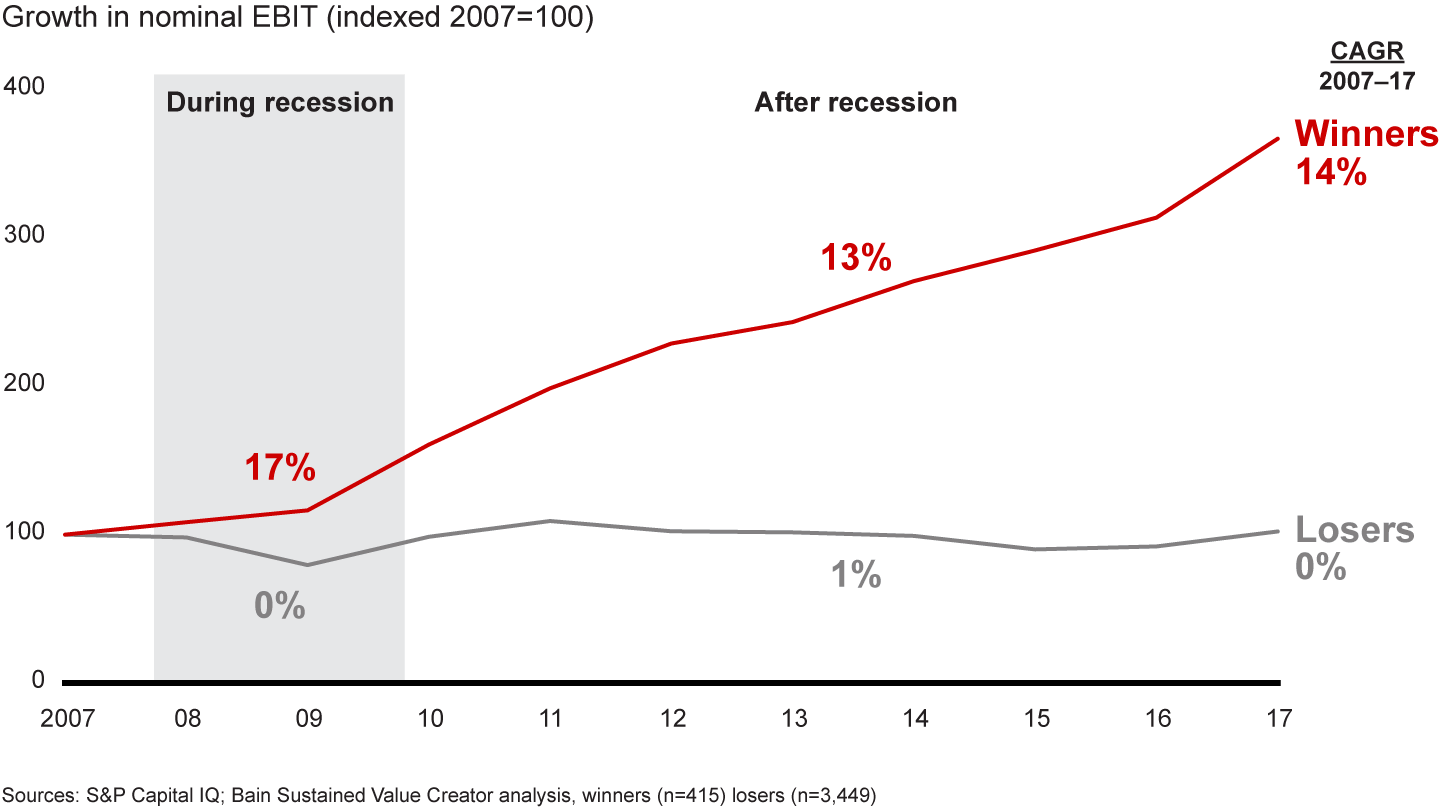 - Preparing now enables companies to gain market share and accelerate: Winners pulled away from losers during the last recession and widened the profit and market-cap gap during the subsequent expansion, Bain’s analysis of nearly 3,900 companies worldwide shows.