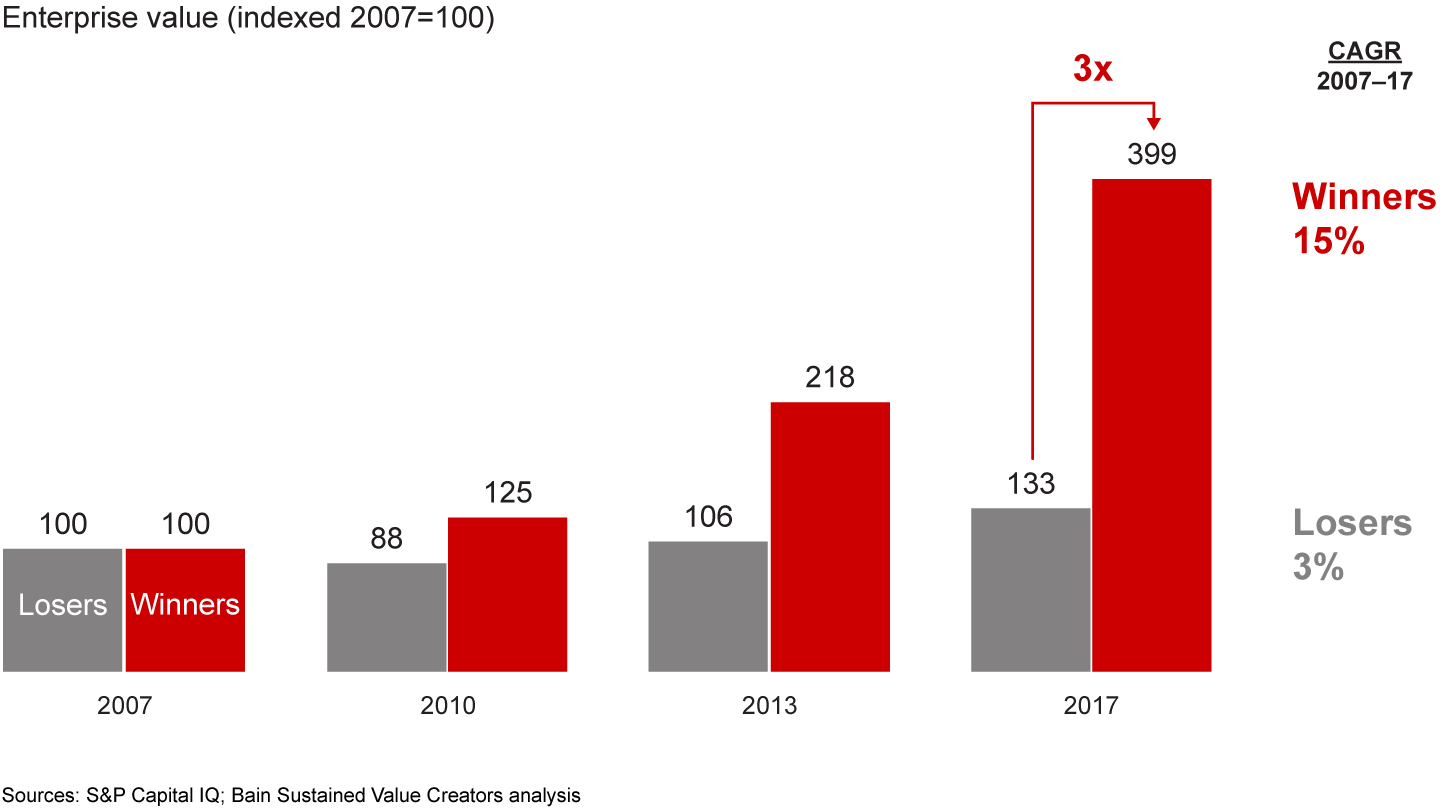Downturns rearrange the board. The number of US companies that substantially increased profits was 47% higher during the last downturn than during stable periods. And 89% more US companies lost profitability in the last downturn vs. stable periods. No question, recessions can swing the future market capitalization of a company by billions of dollars. For two US companies with a similar enterprise value in 2007, for example, our Sustained Value Creators analysis finds that the winners’ average enterprise value grew three times that of the losers by 2017 (see Figure 3). That difference is worth $6 billion in additional enterprise value, based on the median for the companies in our database.