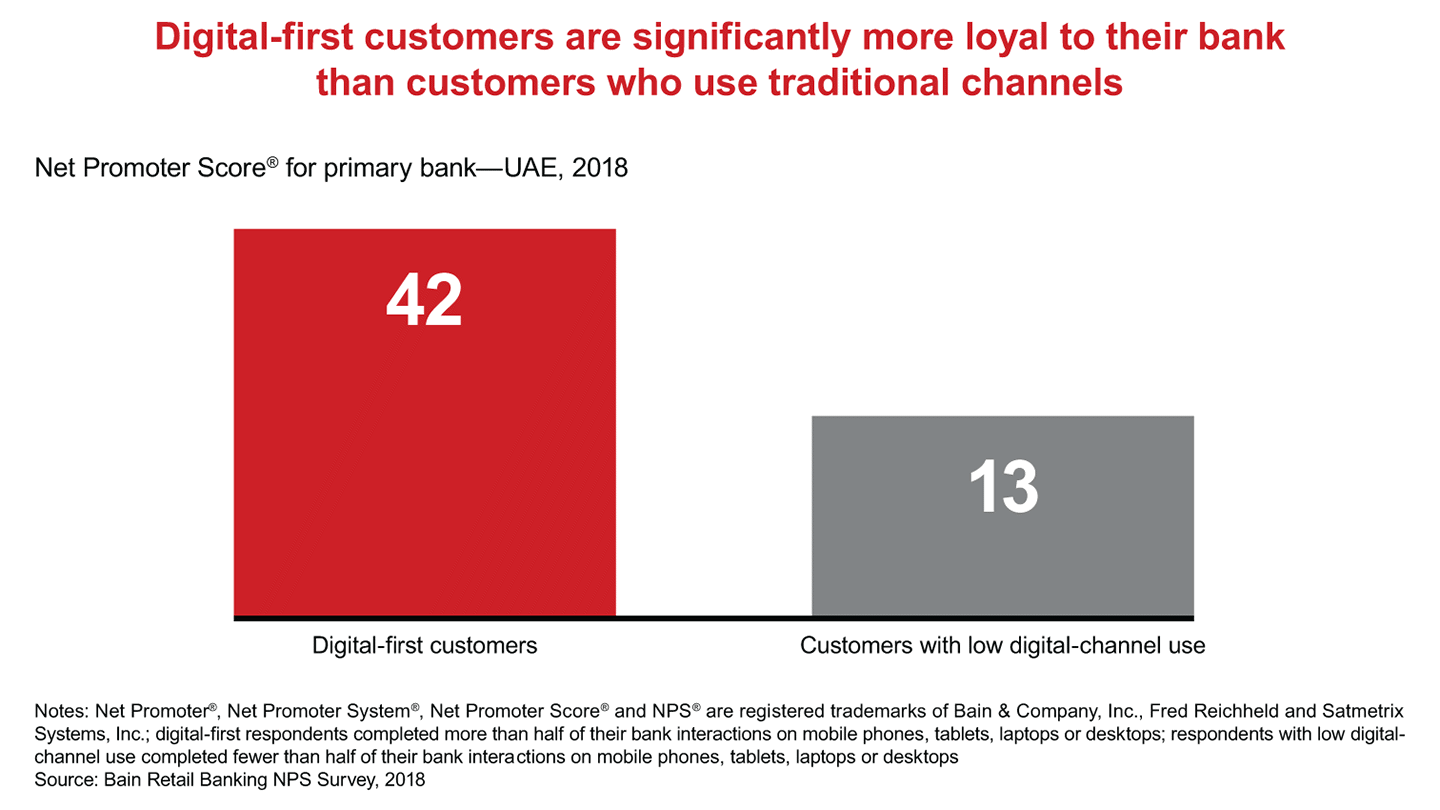 Banks in the United Arab Emirates have a huge opportunity to develop ways to engage their retail customers on a digital basis. While nearly 70% of UAE customers interact with their banks digitally, that group is much higher in other countries, according to Bain & Company’s survey of 152,000 bank consumers in 29 countries, including more than 1,600 customers in the UAE.