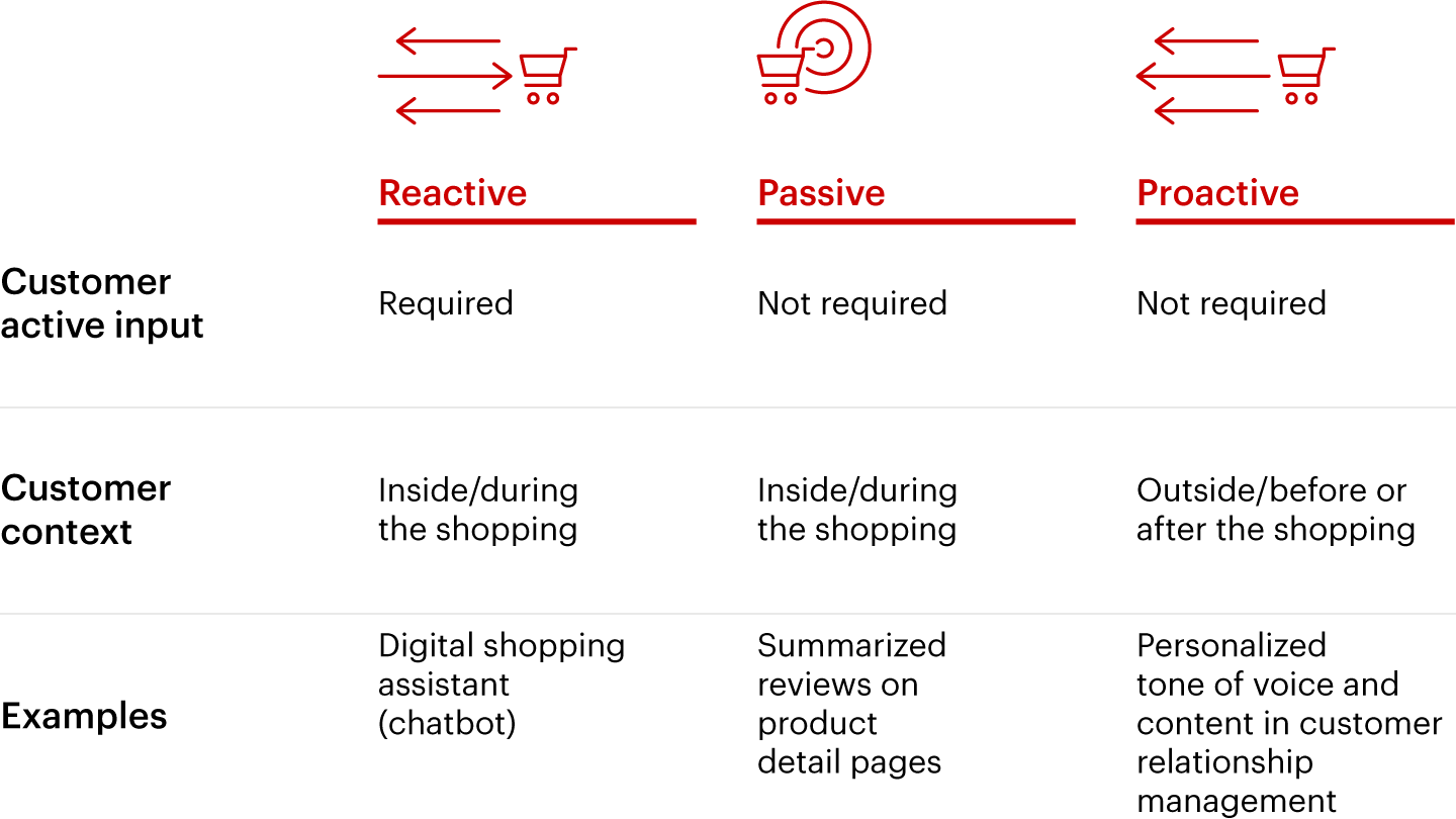 Tools such as ChatGPT, which reacts to a customer interaction, have captured the public's imagination, and they have provided an excellent interaction model for experimentation. In order to harness the full potential of generative AI, however, our research suggests that retailers can and should deploy multiple archetypes of interaction across the purchase journey, serving customer needs with not only reactive experiences but also passive and proactive ones (see Figure 2).