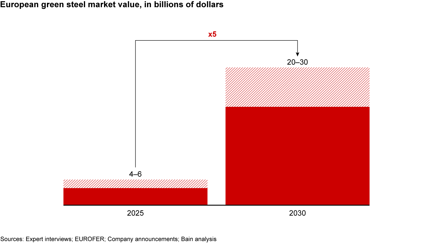 Given the size of traditional commodity markets, green commodities are likely to reach impressive scale quickly. For example, we expect between 15% and 25% of European steel production to be low carbon by 2030, or about 25 million to 35 million metric tons. Based on expected prices, that volume represents a $20 billion to $30 billion market (see Figure 2).