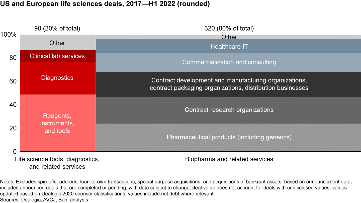 Out of the roughly 410 unique life sciences deals completed for US/EU assets between 2017 and mid-2022, 75%–80% were pharma-related; the remaining 20%–25% were in life sciences tools or diagnostics. Within biopharma deals, there were five major sectors of activity that each represented at least 25 deals—contract research organizations (CROs); contract development and manufacturing company (CDMOs)/contract packing organizations/distribution businesses; commercial pharma products; commercialization services; and pharma IT. Within life sciences tools, two major sectors of activity represented at least 25 deals—reagents/instruments/tools and diagnostics. Clinical lab services represented a smaller number of deals completed but were mostly all in the EU.