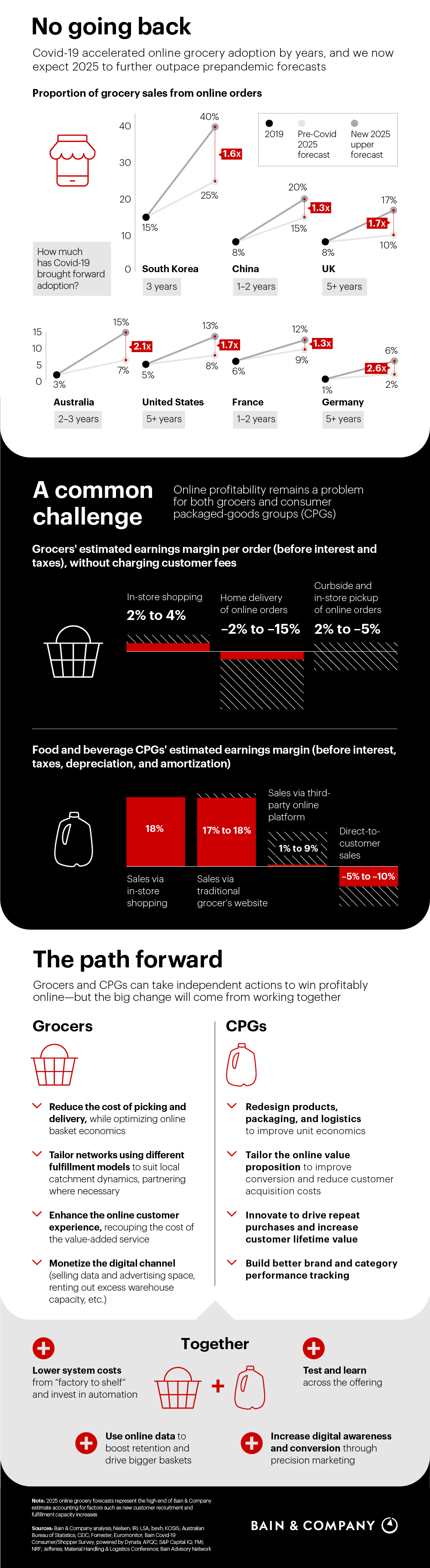 While online grocery has continued to surge, grocers and consumer packaged-goods groups must work together to fix the dilutive economics of the channel.