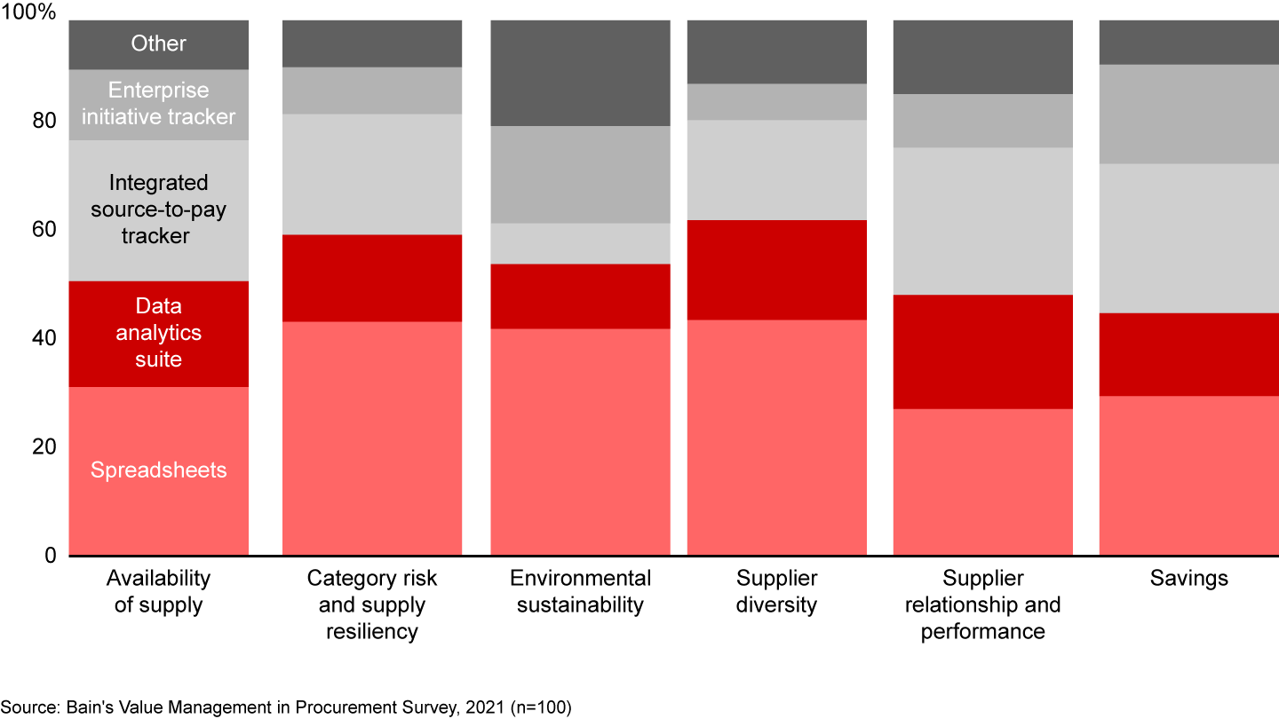 Tracking and balancing the many competing objectives of the business, finance department, and other stakeholders is a growing challenge for global procurement leaders and the broader organization. It’s common to see multiple tools and trackers within the same organization—in some cases, even in the same department—as an attempt to collect and reconcile value across multiple initiatives (see Figure 3). Many are homegrown solutions built in Microsoft Excel, Power BI, and Tableau.