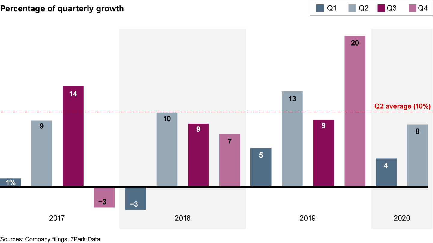 Bain’s analysis of spending and utilization data provided by 7Park Data found that first-quarter 2020 cloud spending growth was just a bit lower year over year and that the second-quarter 2020 growth rate was significantly lower year over year (see Figure 1). Of course, the rates differ by categories: Security and collaboration services are notable exceptions, with spending on the rise to accommodate more remote work (see the Bain Snap Chart “Lockdowns Spike Spending on Collaboration and Software Tools”). But, in general, investment in IT has paused: Even Amazon Web Services' growth has slowed during the pandemic, growing only 29% in the second quarter after reporting 33% growth in the first.