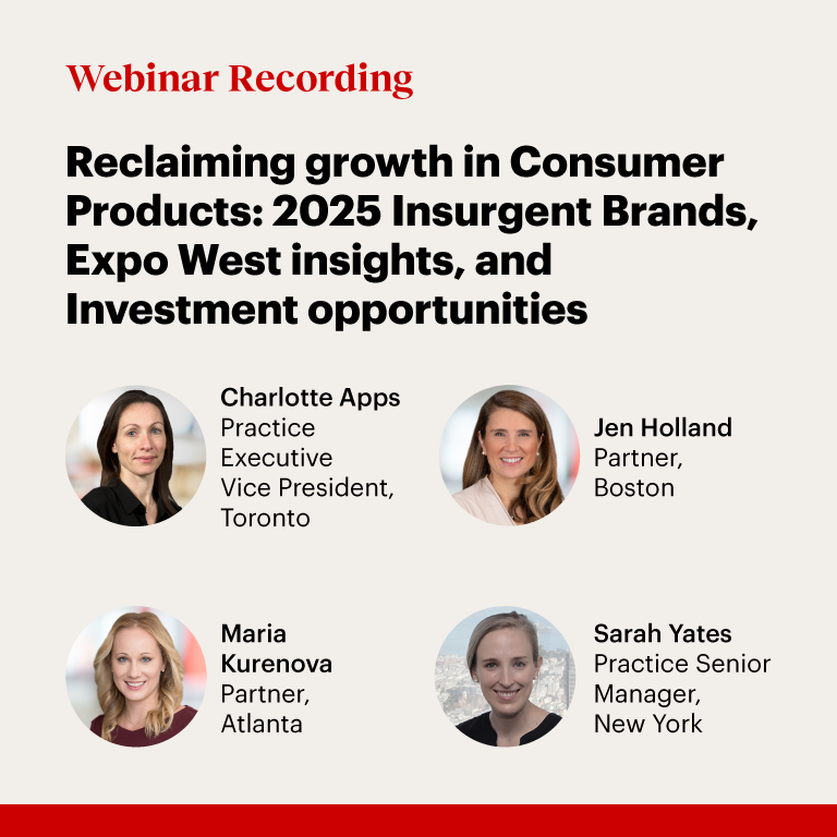 Insurgent brands continue to capture outsized share of growth in consumer products. Every year, we track the latest insurgent brands that are outperforming their markets, presenting both a challenge and an opportunity to their larger consumer product counterparts. Our insights include data on these fast-growing brands, research on their growth models, lessons on acquiring and scaling them, and interviews with insurgent brand leaders.