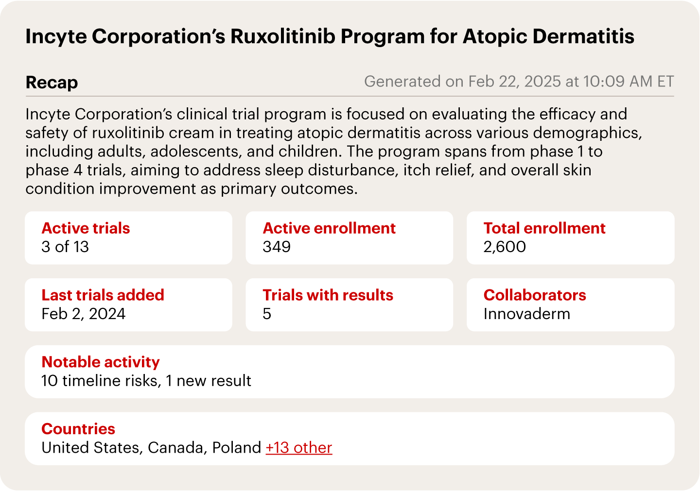 With AI and public data, we can generate a real-time snapshot of a single trial, providing a comprehensive view of the overall progress and potential risks, such as those in Incyte’s ruxolitinib program for atopic dermatitis (AD) (see Figure 1).