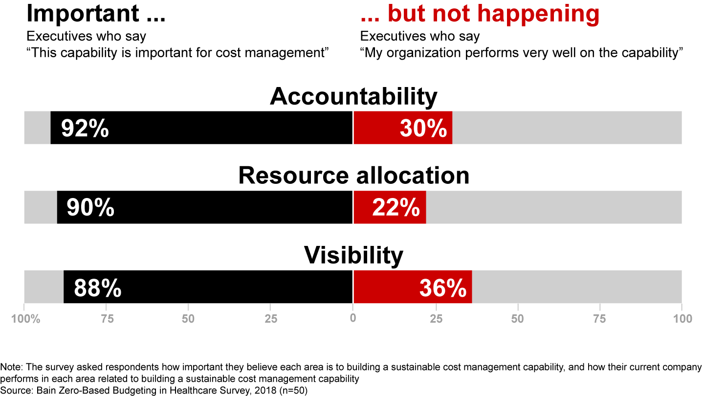 Why is it so effective? Zero-based budgeting offers leadership teams vastly improved visibility and accountability. It helps them see exactly what is being spent and who is spending it, and the day-to-day activities that generate costs. Those insights are a huge advantage for pharma companies, which traditionally have had difficulty tracking their spending, given their global reach and multitude of business units with separate P&Ls competing in different therapeutic areas. Although 75% of pharma companies have undertaken major cost programs over the past five years, only 5% reported achieving all of their goals, according to Bain’s 2018 Zero-Based Budgeting in Healthcare Survey.