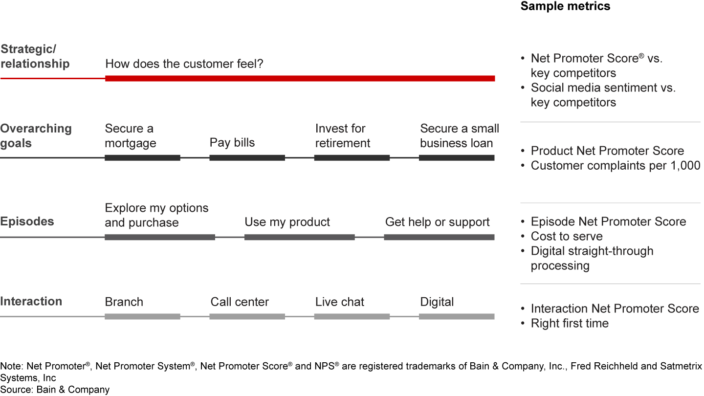 Robust metrics and feedback mechanisms promote learning and action at pace. Virtually all banks track metrics. But all too often, they rely heavily on high-level competitive benchmarks (whether loyalty, satisfaction or another measure) rather than the full suite of customer feedback and financial and operational metrics required to produce better customer outcomes (see Figure 3). Leading banks and card companies track a suite of such metrics that range from social media sentiment to cycle time to digital straight-through processing to the percentage of “right first time” interactions at a contact centre. They have also implemented a strong system or routines to manage those outcomes.