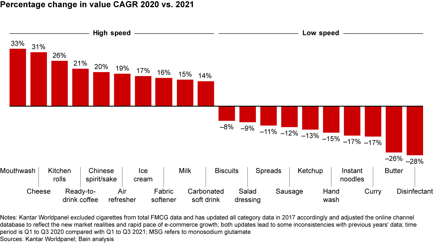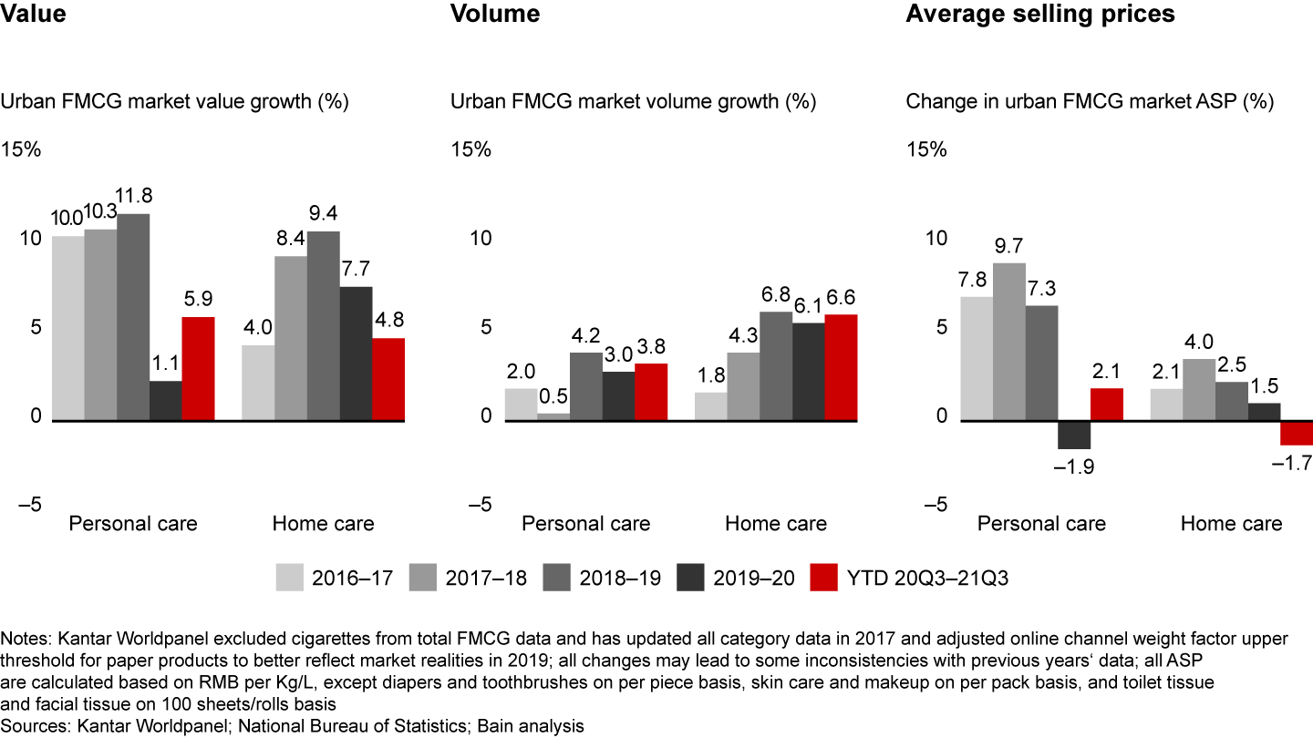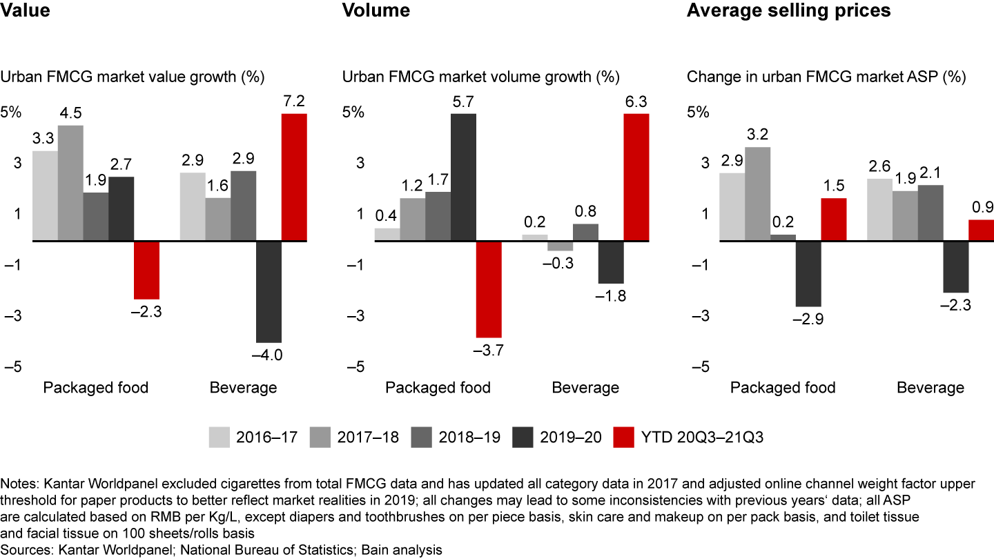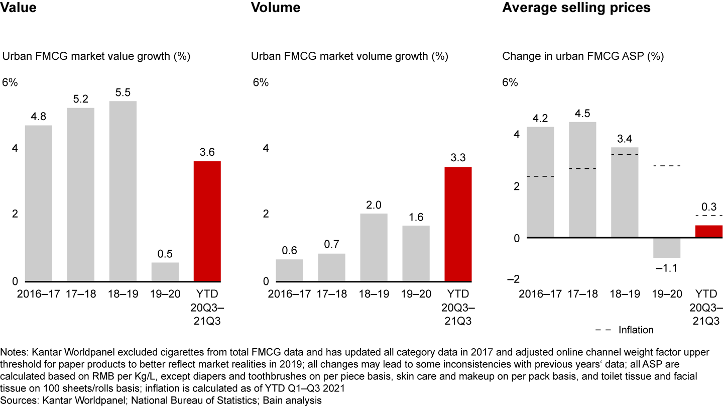 - After a strong post–Covid-19 recovery in the first quarter of 2021, China’s FMCG sales declined to negative .8% growth by the third quarter, the result of mounting macroeconomic pressures.