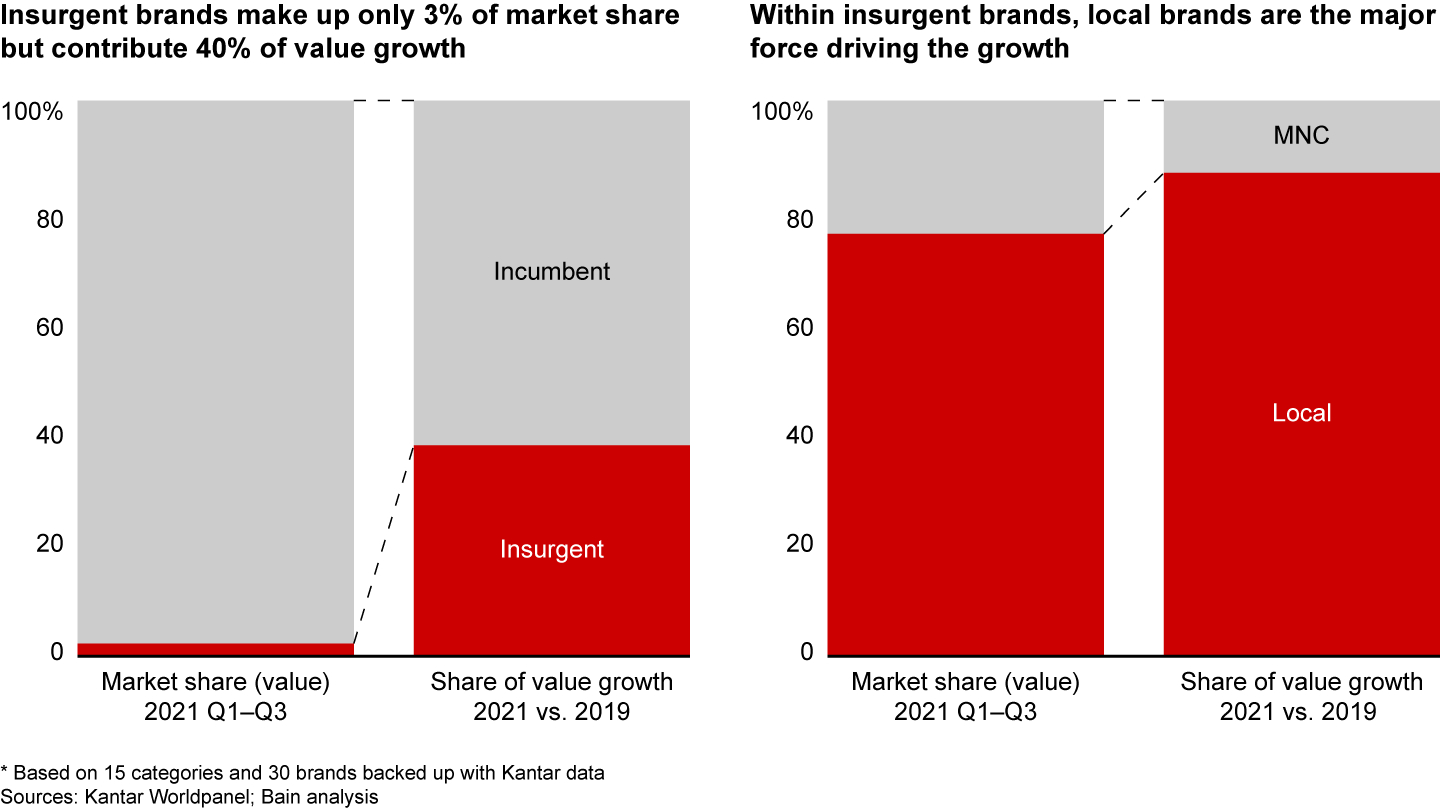 In China, local insurgents are far more powerful than multinational insurgents in both market share and their share of value growth. The data is impressive: Chinese insurgents claim about 80% of the market share and 90% of the value growth among insurgents.