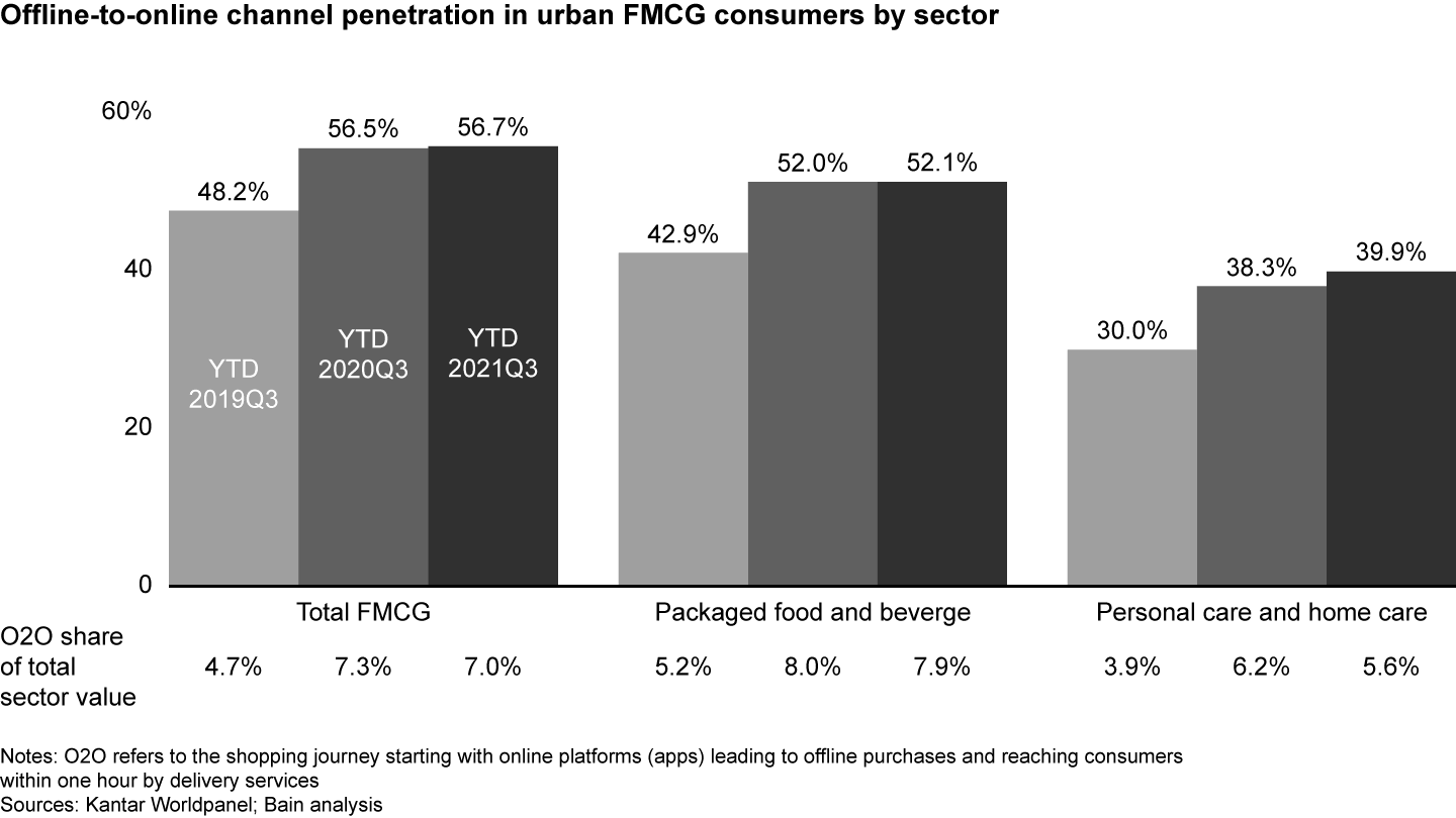 Consumers like livestreaming’s convenience, which is also a big part of the appeal of O2O (online to offline) retailing, a phenomenon that boomed during the pandemic. O2O accounts for 7% of all FMCG value and its penetration among consumers remains above 50% for FMCG categories (see Figure 7). While consumers turn to livestreaming for categories like makeup and apparel, they use O2O channels for products that are cheaper, handy, and require less emotional involvement. Think toilet tissue, facial tissue, and packaged water. These are products that consumers run out of and quickly order for one-hour delivery. As Covid-19’s effect on purchasing behavior lessened, O2O penetration remained flat and the share of value from O2O slightly declined.