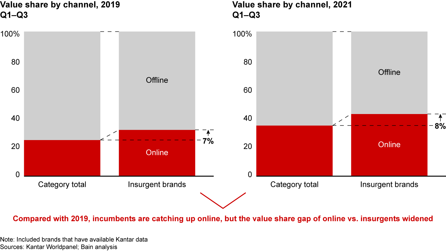 However, the rate at which insurgents erode incumbent market share varies dramatically by product category. Insurgents have captured more share in carbonated soft drinks than in beer, for example. In general, insurgent brands stand out in categories that are characterized by repertoire behavior, in which they have well-established upstream solutions with original design manufacturers or original equipment manufacturers and are less reliant on heavy asset investments—as there are in offline channels. Other important ingredients that turbocharge insurgent brands’ growth are “star” entrepreneurs and capital injections.
