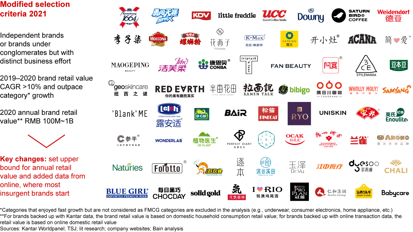To build on our lessons from those 46 Chinese insurgents, we have begun conducting a similar—and extensive—study of a new collection of representative insurgent brands across more than 40 categories, ranging from dairy company Adopt A Cow to baby snack insurgent Little Freddie to skin care’s Little Dream Garden. Our “Class of 2021” insurgents include 69 FMCG players that we will follow in the years ahead, taking a slightly different approach (see Figure 13). For example, we have introduced an upper limit to the required brand retail value (RMB 1 billion) and will add data from online sales, the source of the bulk of revenues for most insurgents. We’ve also included insurgent brands owned by major incumbents, such as ABI’s Blue Girl Beer and L’Oréal’s 3CE makeup brand. It is interesting to note that the Class of 2021 has more than a dozen brands owned by international companies and large local companies, a positive sign that these insurgent brands can be seeded and nurtured within larger corporations.