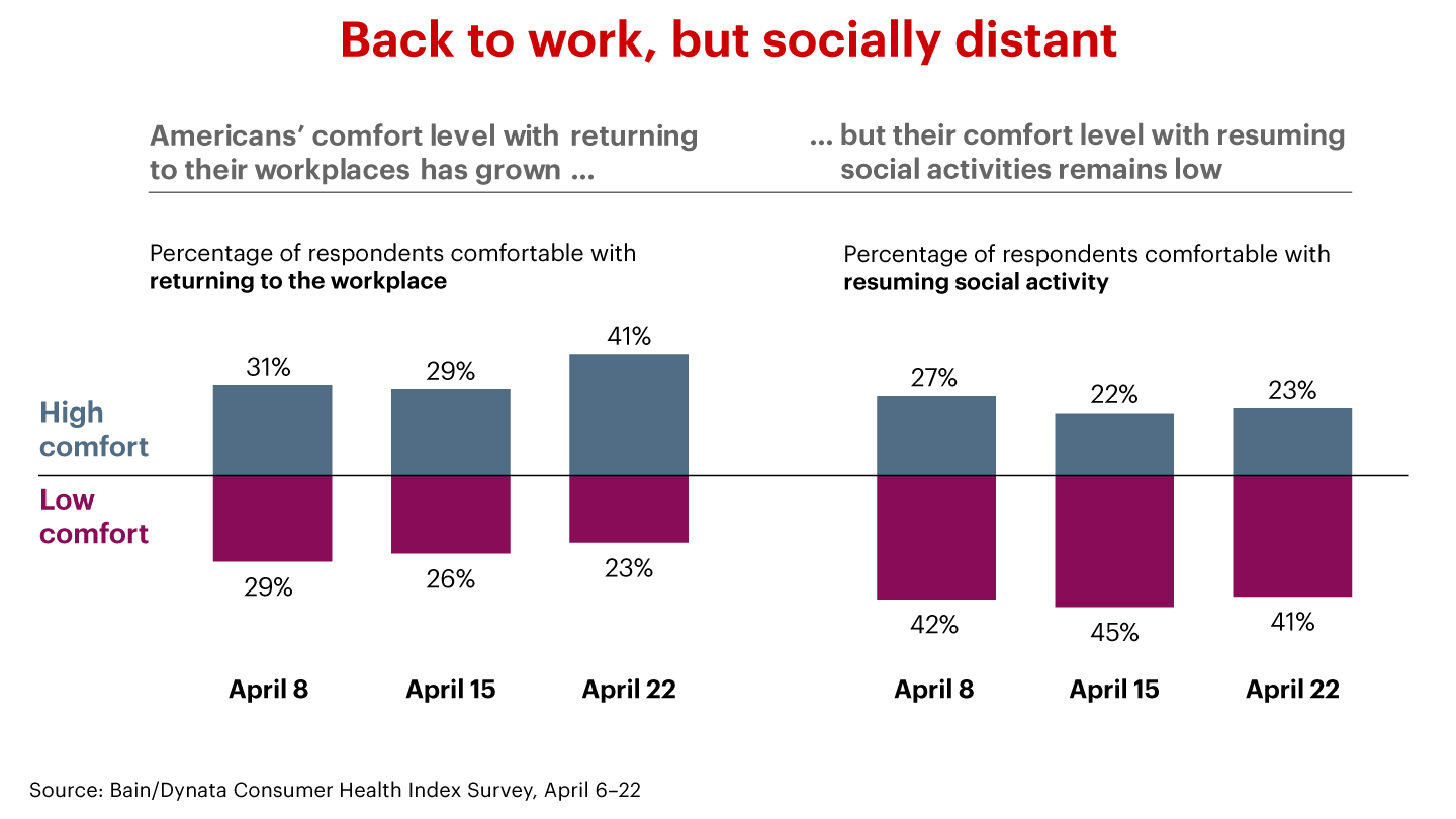 The most recent Bain/Dynata survey of US consumers, conducted from April 20 to April 22, finds that 41% of respondents are highly comfortable with returning to work, up from 29% the prior week, while only 23% are highly comfortable with resuming social activities such as dining out, which was on par with the previous week.