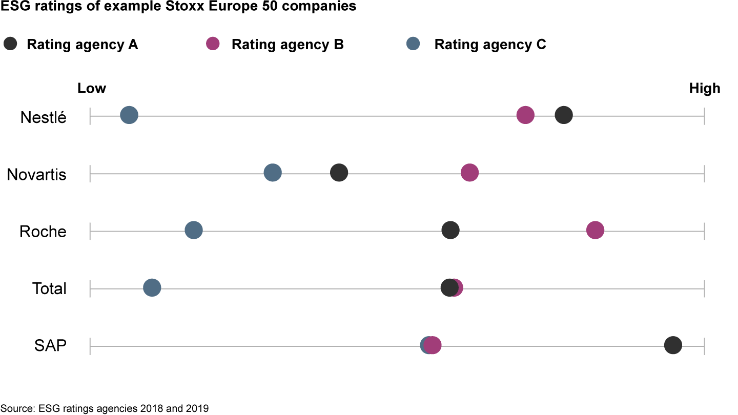 For instance, rating agencies acquire data differently and use different statistical models to estimate unreported data. Some do not even publish the weightings they use to assess individual investments or sectors. Based on the different methodologies used by three popular rating agencies we sampled, their ESG ratings of Stoxx Europe 50 companies vary greatly (see Figure 1). The correlation of ESG ratings among top ESG rating agencies averages 0.61, compared with 0.99 for credit ratings by the most relevant agencies. For the governance factor, it is as low as 0.30.