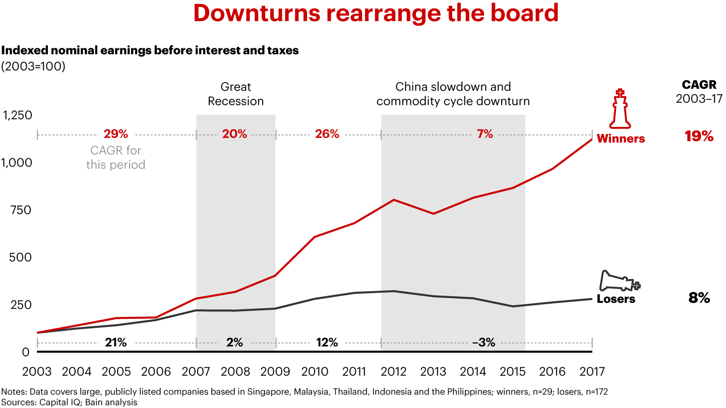 Downturns rearrange the board. Bain analysis of company earnings in Southeast Asia finds that winners diverged from losers during the 2007–2009 global recession and widened the gap during the subsequent expansion. Preparing before a downturn gives companies more options. Specifically, winning companies in Southeast Asia excelled in four areas: a focus on cost productivity, aggressive commercial plays, tight balance sheet management and proactive M&A.