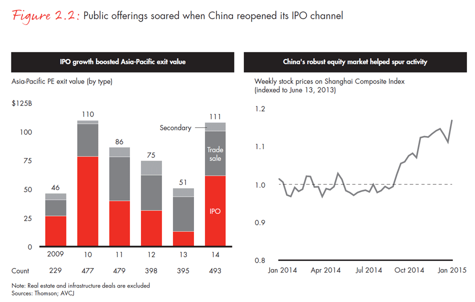After three years of steady declines, 2014’s surge in exit value was perhaps the year’s most encouraging development. It allowed PE funds in the Asia-Pacific region to exit investments worth $111 billion, more than double the value of 2013 exits and a touch higher than the previous all-time record of $110 billion in 2010. Exit value had bottomed out at $51 billion in 2013, when the Chinese government temporarily closed the nation’s renminbi-denominated IPO market to combat fraud. But the reopening of the Chinese IPO channel led to a 218% surge in exit value in Greater China (China, Hong Kong and Taiwan), owing in large part to the $25 billion Alibaba offering in September 2014 (see Figure 2.2). Even excluding that massive deal, overall exit value still rose 69% and the absolute number of exits jumped 25%.