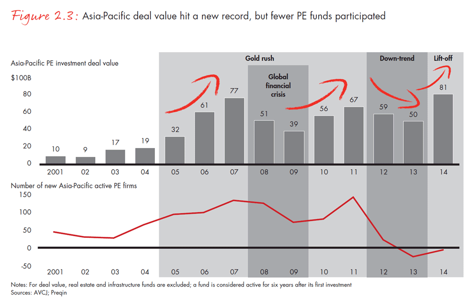 It’s hard to overestimate the importance of LPs turning cash positive in 2014. Investors have enthusiastically pumped large amounts of capital into the region for more than a decade, only to be disappointed by anemic distributions and sliding average returns. As they became over-allocated in crucial markets such as China and India, they began to look elsewhere in the world with new capital, waiting for the Asia-Pacific market to catch up.