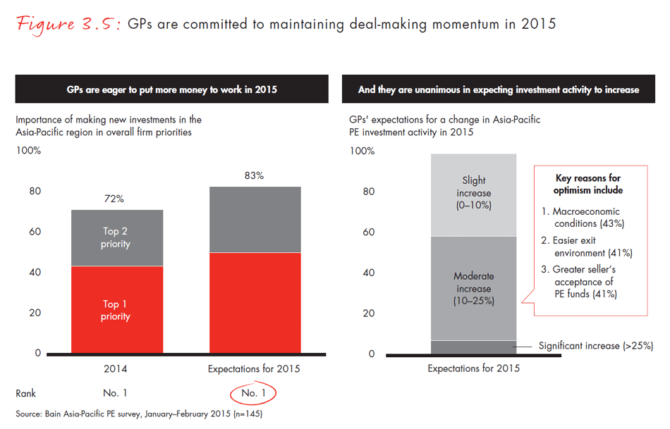 Bullishness on the ground. The GPs in our survey unanimously said they expect at least a slight increase in deal activity in 2015. That’s probably not surprising given the record $132 billion in dry powder sitting in Asia-Pacific portfolios (see Figure 3.4). A full 83% of GPs said that making new investments would be the firm’s first or second priority in 2015 (see Figure 3.5). That means that even if competition and rising asset prices provide headwinds, GPs will be pushing harder than ever to find ways to make more deals happen.